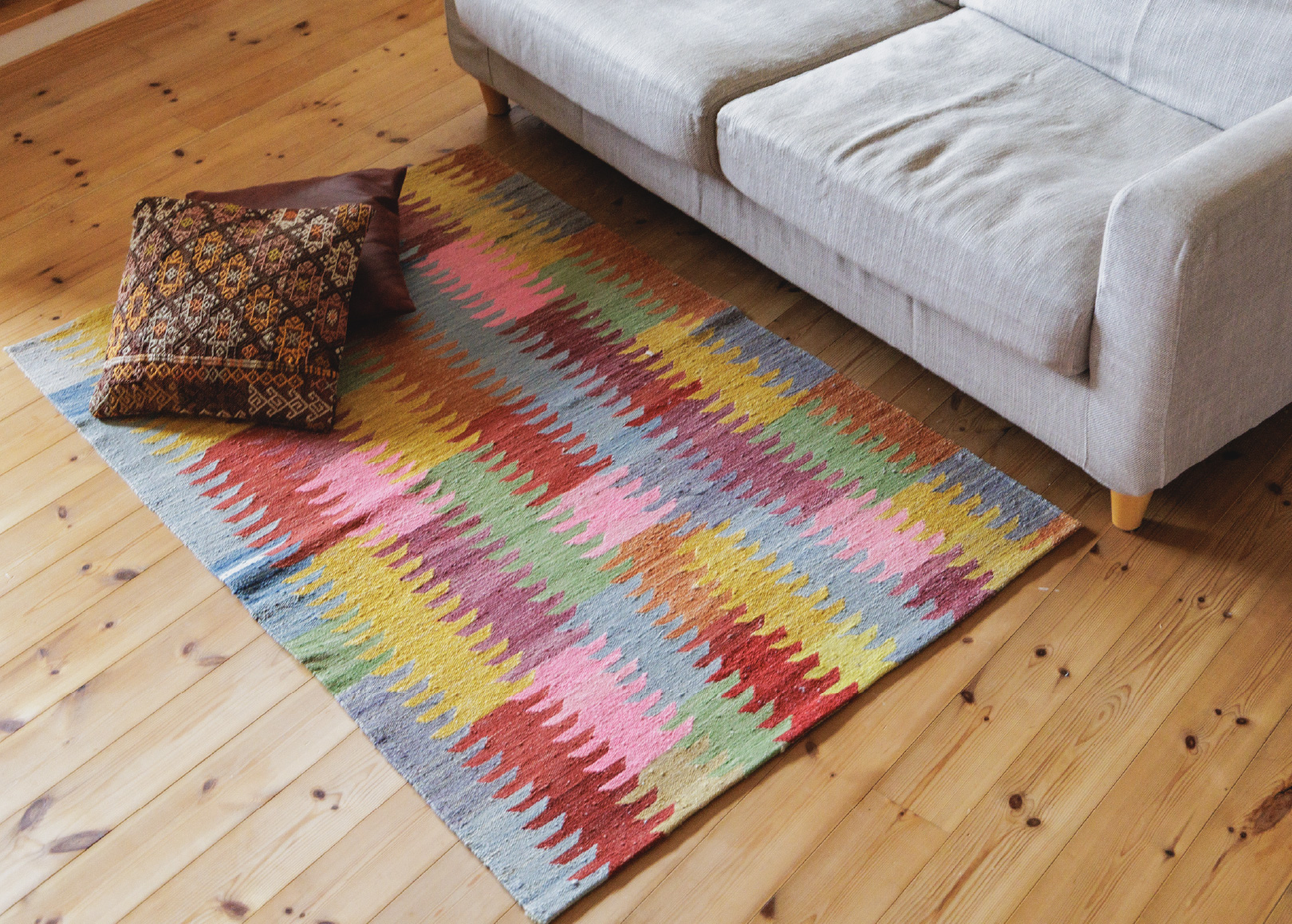 キリムは、トルコやイラン、コーカサスなど、中近東の遊牧民の伝統的な織物です。これは約150年前のもの。「女性たちが家族や子どもの幸せを祈りながら織り上げたもの」という背景に惹かれ、越前市のGecko Cafeで購入しました。色の鮮やかさが特に気に入っています。