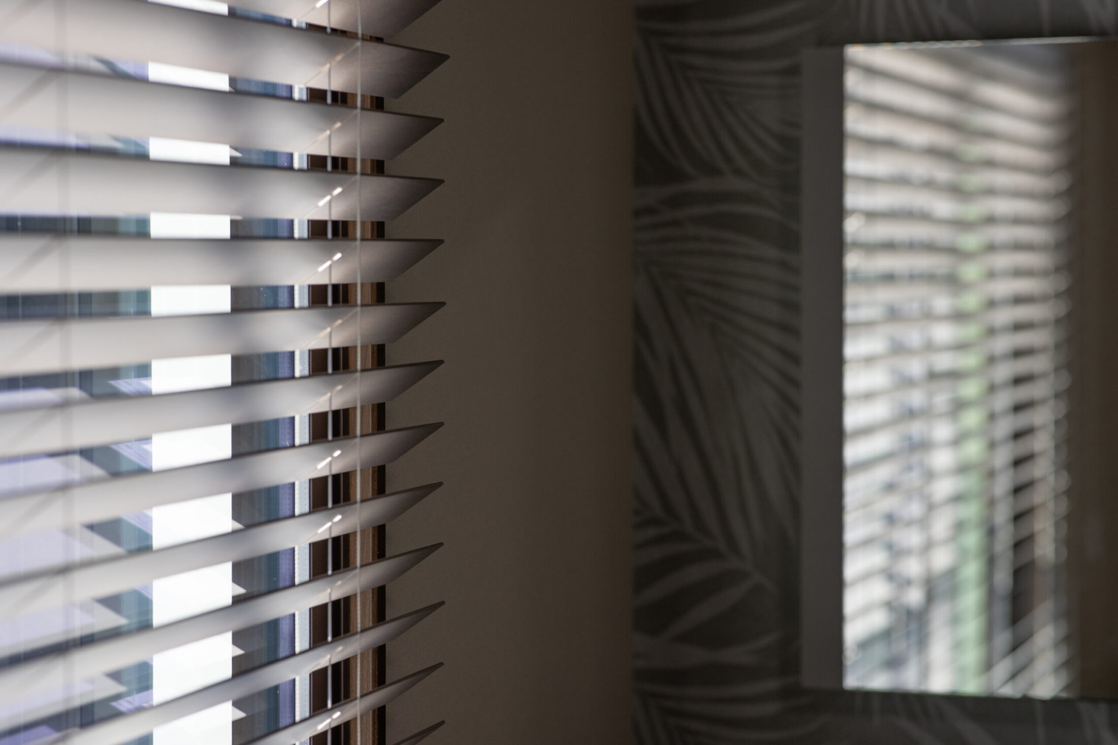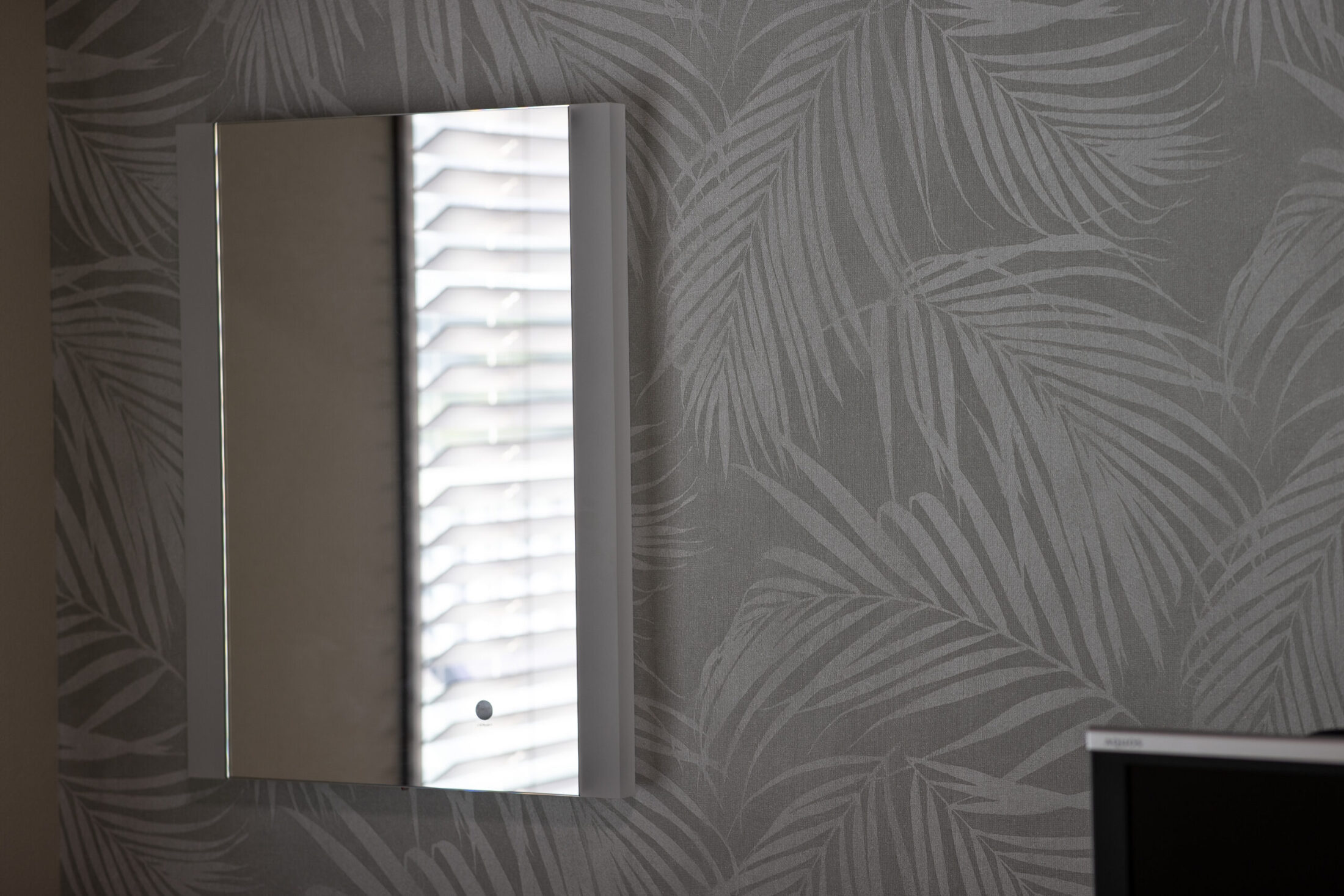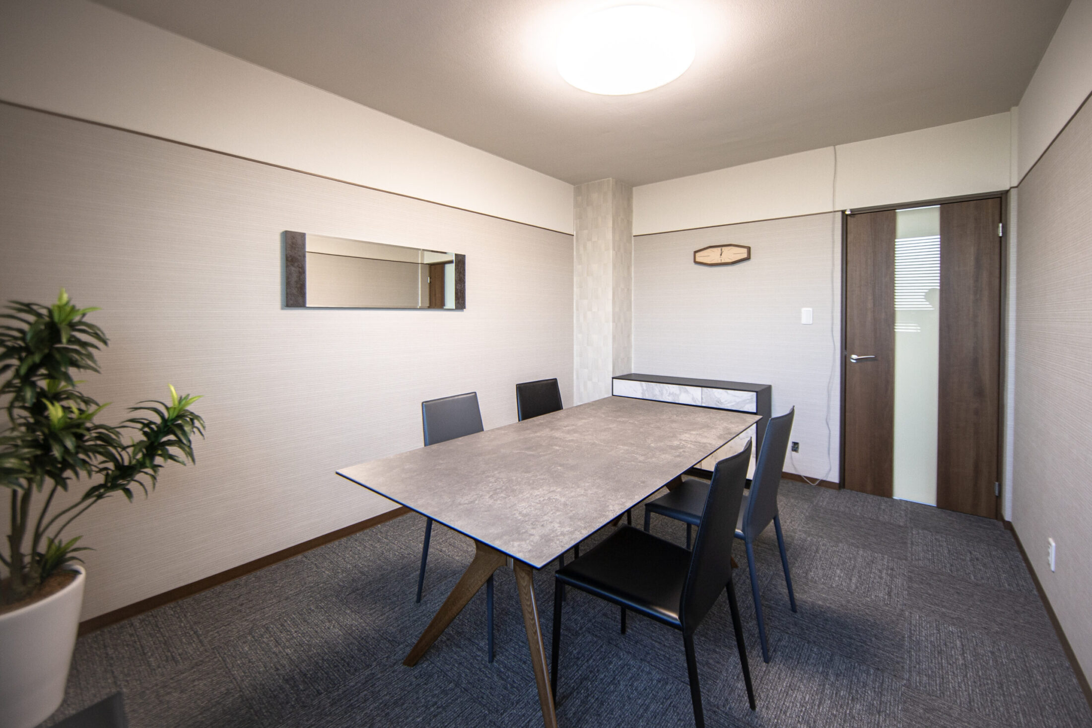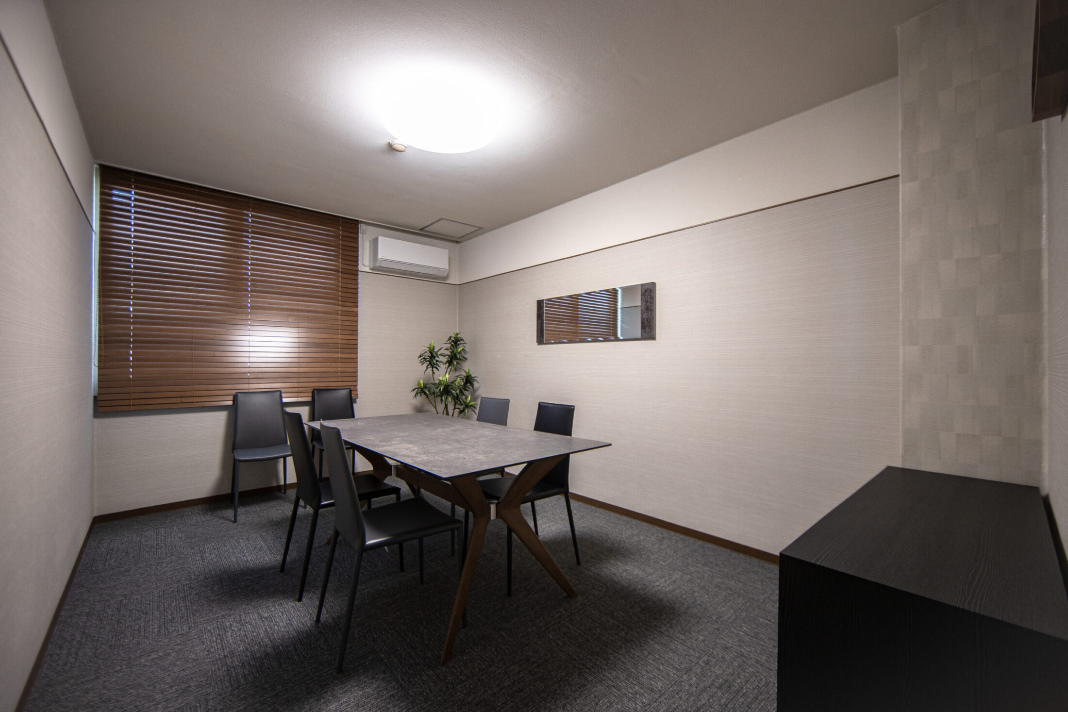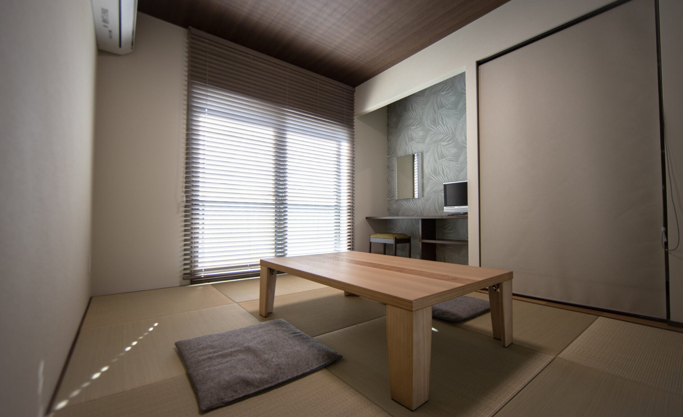 休憩室にはお昼休憩でゆっくりできる『畳部屋』を採用。リラックスできるようにグレーを貴重とした木目長のカーテンを選択。『女優鏡』を設置するなど、職員のモチベーションが上がる空間づくりが実現しました。