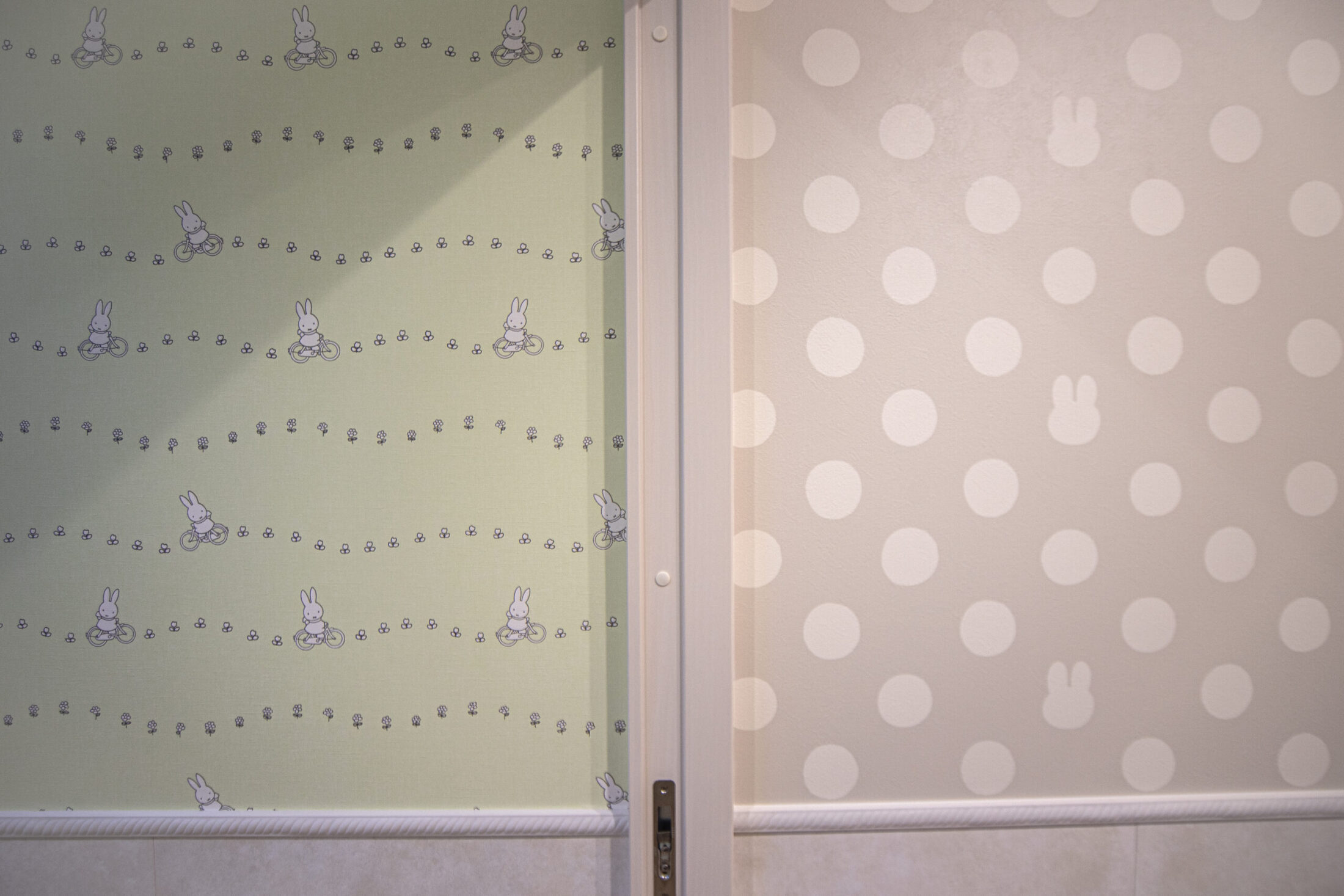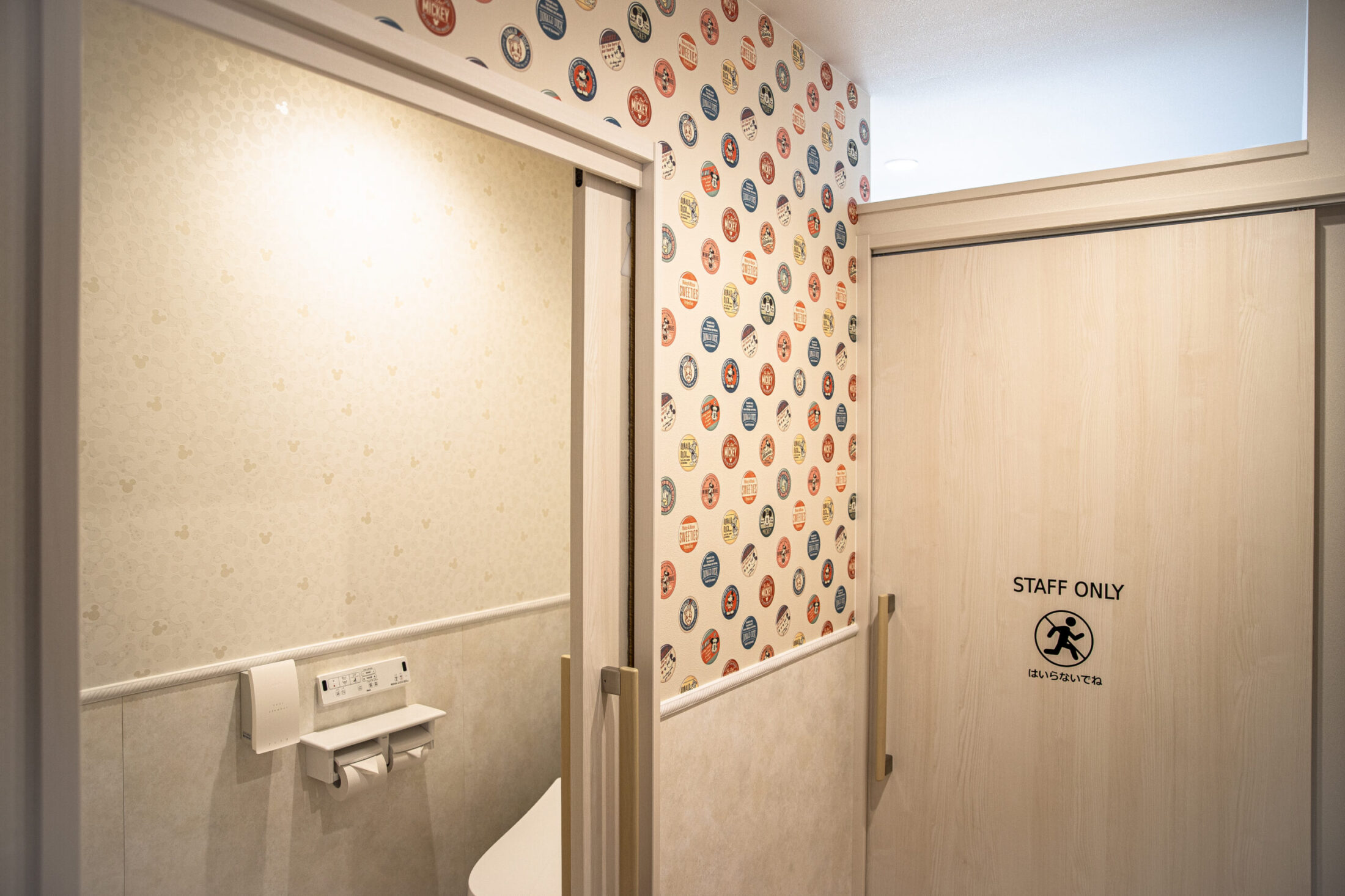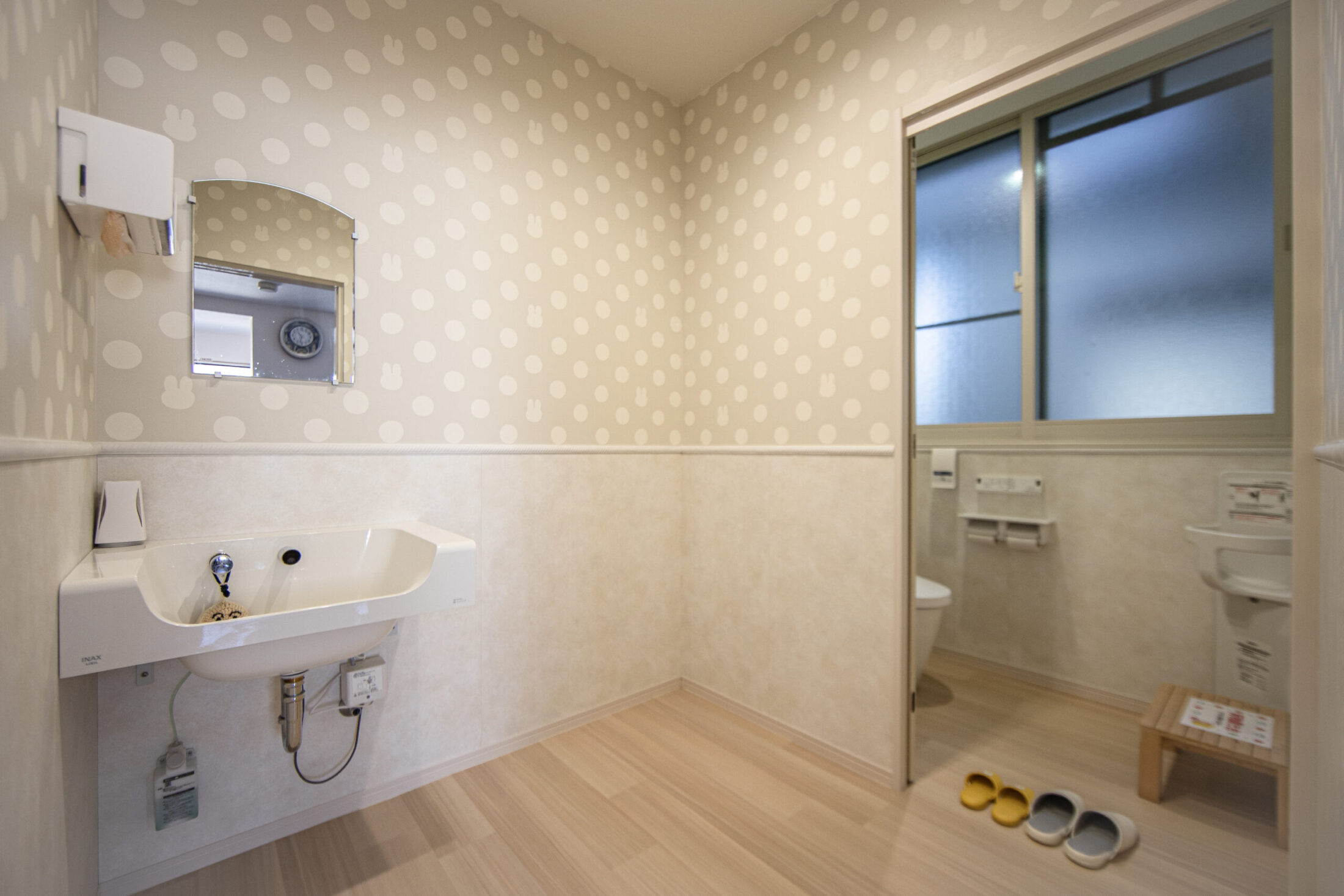 女子トイレの壁紙は、奥様なら選ばないような、洗練されたミッキー柄など遊び心がありながらもプロのセンスが光るデザインを採用し大人の遊び心と清潔感を両立「かわいい」と、スタッフや利用される患者さんのママさんたちにも大好評です。